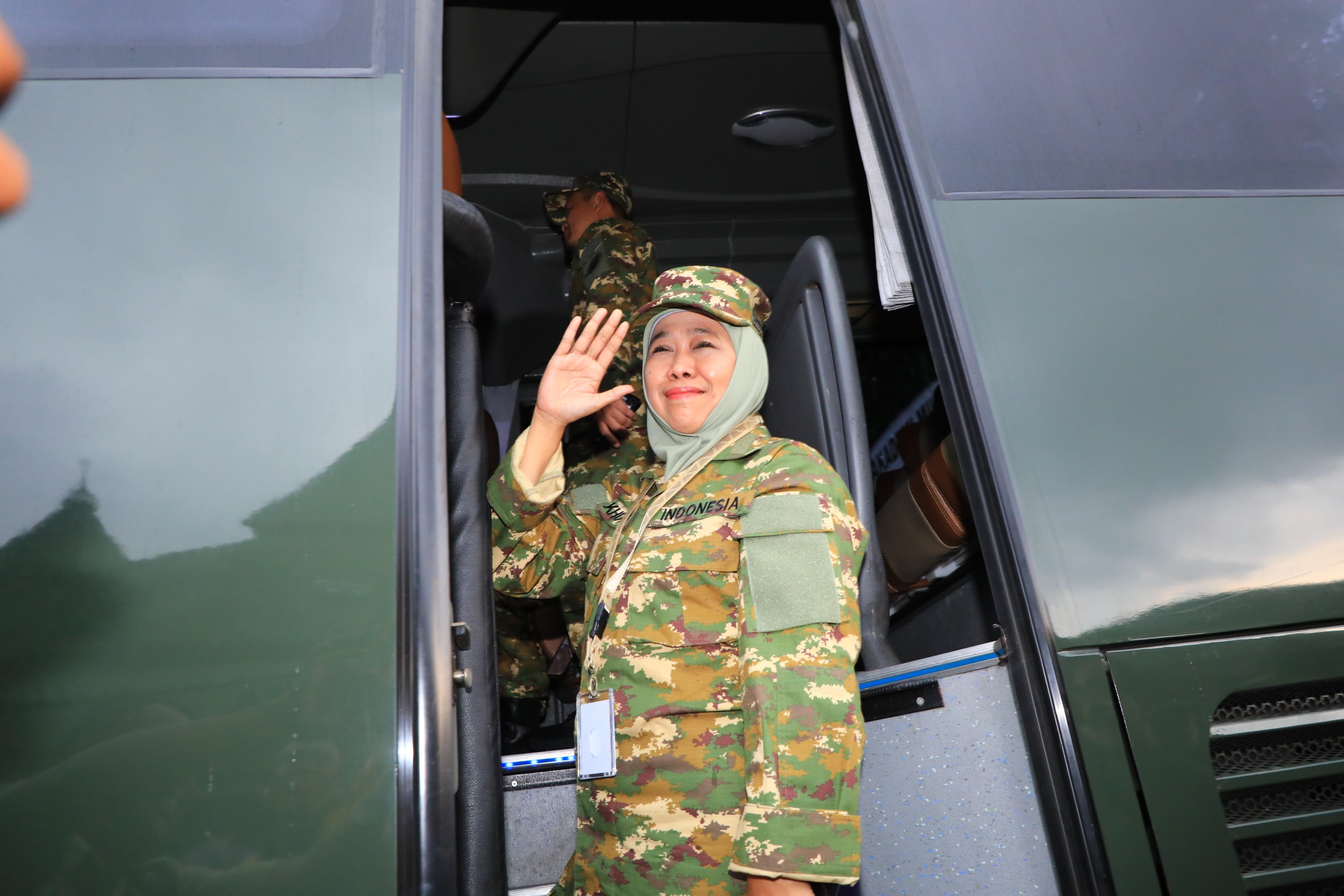 Tiba pagi di kawasan Akmil, Khofifah telah siap termasuk dengan pakaian Komcad TNI atau pakaian dinas lapangan loreng hijau yang telah disiapkan. Tidak hanya itu, Khofifah juga lengkap mengenakan topi dan sepatu PDL hitam, dan topi loreng.