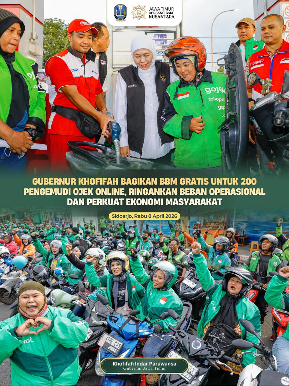 SIDOARJO, 9 APRIL 2026 – Gubernur Jawa Timur Khofifah Indar Parawansa membagikan bahan bakar minyak (BBM) subsidi jenis Pertalite secara gratis kepada 200 pengemudi ojek online (ojol) di Sidoarjo, Rabu (8/4).