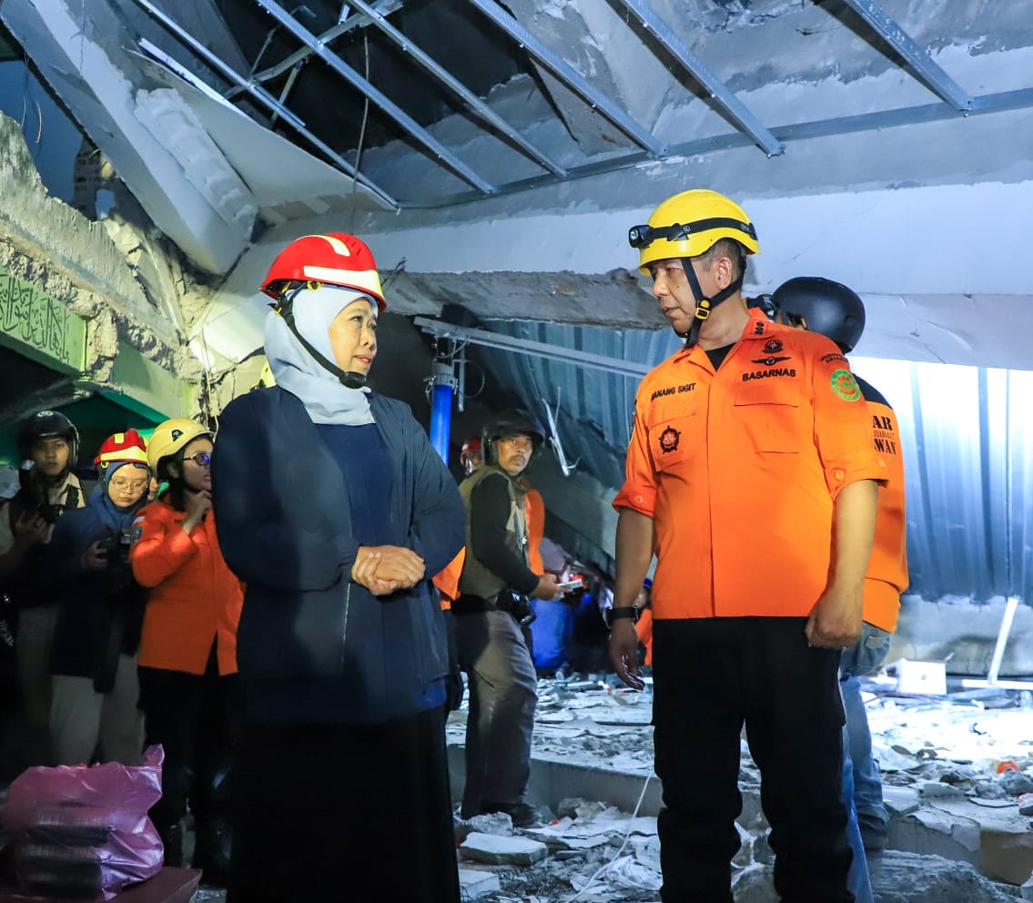 Gubernur Khofifah Indar Parawansa turun langsung memastikan seluruh tim gabungan dari Badan Penanggulangan Bencana Daerah (BPBD) Provinsi Jawa Timur dan BPBD Kabupaten Sidoarjo bersama Basarnas, TNI- POLRI serta relawan terus melakukan evakuasi korban pasca ambruknya Musholla di Pondok Pesantren Al-Khoziny, Buduran, Sidoarjo, Senin (29/9).