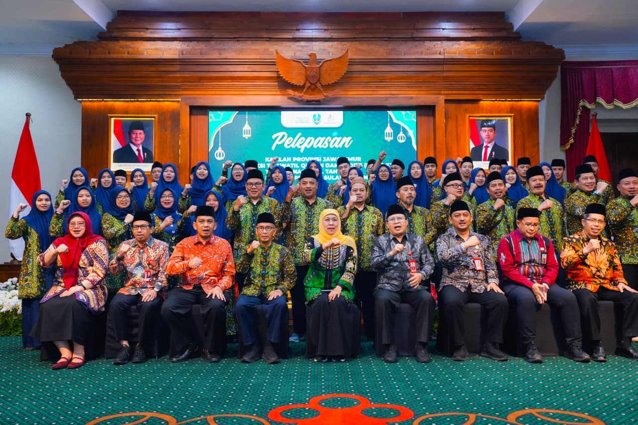 Gubernur Jawa Timur Khofifah Indar Parawansa secara resmi melepas Kafilah Jatim pada Seleksi Tilawatil Qur’an dan Hadis Tingkat Nasional (STQHN) XXVIII Tahun 2025 di Gedung Negara Grahadi Surabaya, Rabu (8/10).