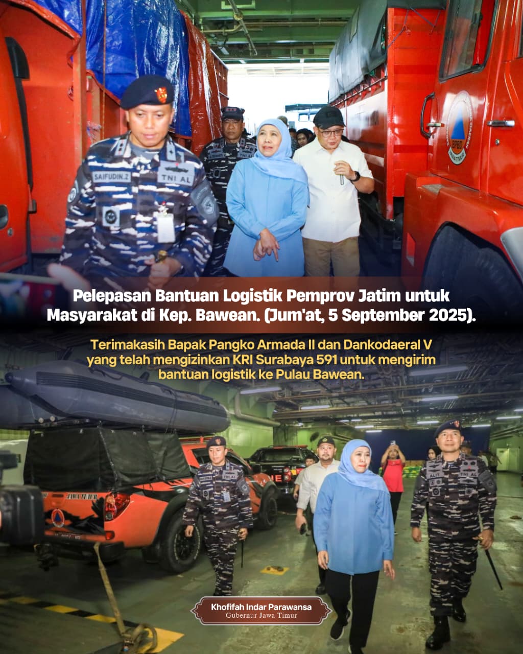Gubernur Jawa Timur Khofifah Indar Parawansa kembali menunjukkan kepeduliannya terhadap masyarakat di daerah kepulauan. Kali ini, Gubernur Khofifah secara langsung melepas keberangkatan bantuan logistik untuk warga Pulau Bawean, Kabupaten Gresik, menggunakan Kapal Republik Indonesia (KRI) Surabaya 591 dari Dermaga Semampir Baru Koarmada II Surabaya, Jumat (5/9).