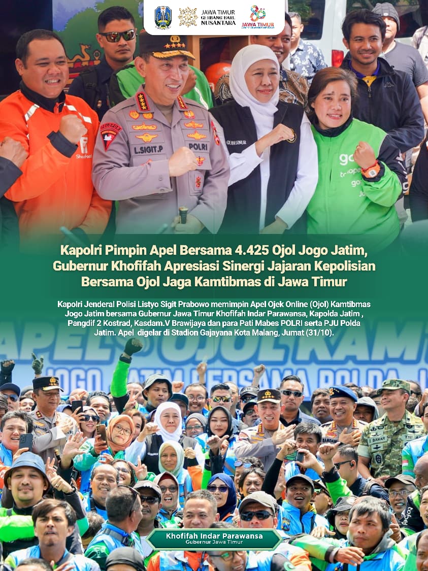 Kapolri Jenderal Polisi Listyo Sigit Prabowo memimpin Apel Ojek Online (Ojol) Kamtibmas Jogo Jatim bersama Gubernur Jawa Timur Khofifah Indar Parawansa, Kapolda Jatim , Pangdif 2 Kostrad, Kasdam.V Brawijaya dan para Pati Mabes POLRI serta PJU Polda Jatim. Apel