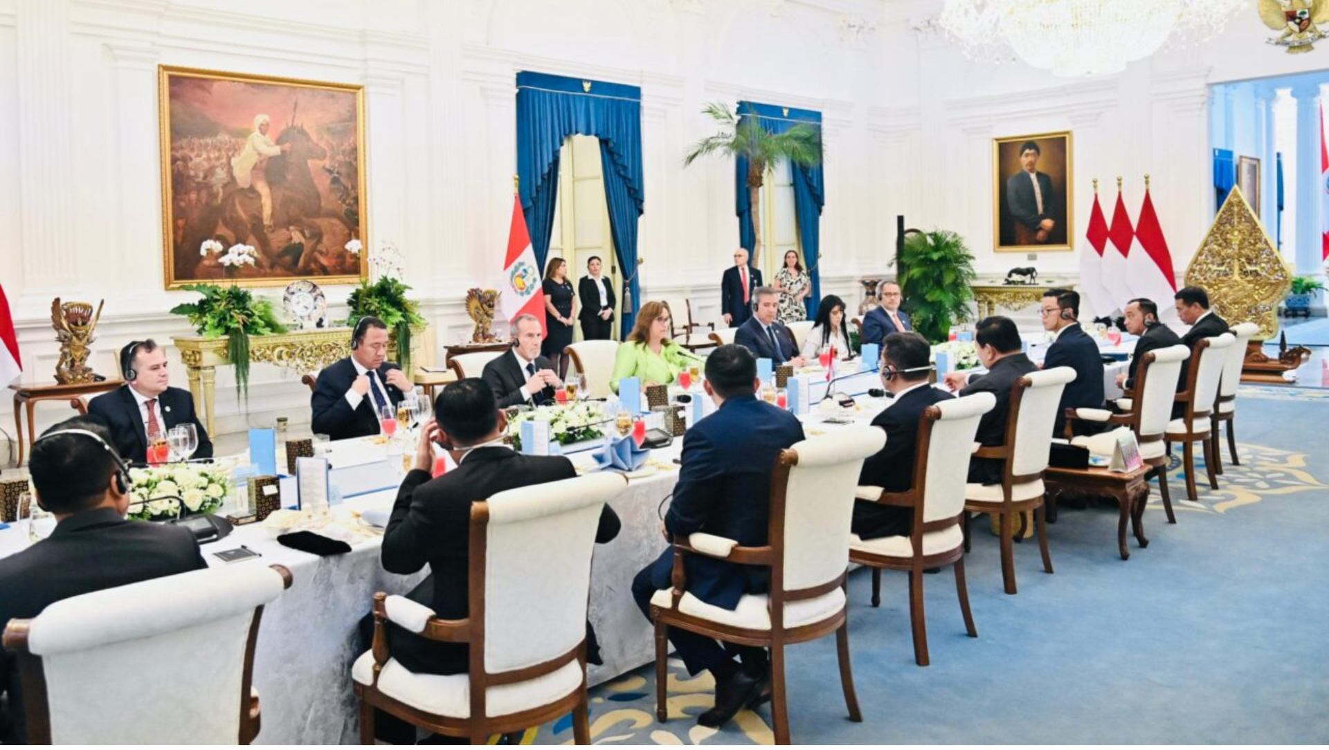 Jakarta – Presiden Republik Indonesia, Prabowo Subianto, dan Presiden Republik Peru, Dina Ercilia Boluarte Zegarra, menggelar pertemuan bilateral dengan format working lunch bersama delegasi masing-masing negara di Istana Merdeka, Jakarta, Senin (11/8/2025).