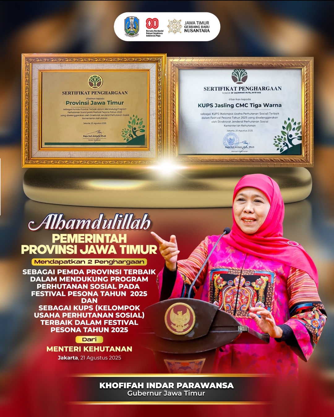Pemerintah Provinsi Jawa Timur kembali menorehkan prestasi di tingkat nasional. Kali ini berhasil meraih penghargaan sebagai Pemerintah Daerah Provinsi Terbaik dalam mendukung Program Perhutanan Sosial oleh Kementerian Kehutanan RI.
