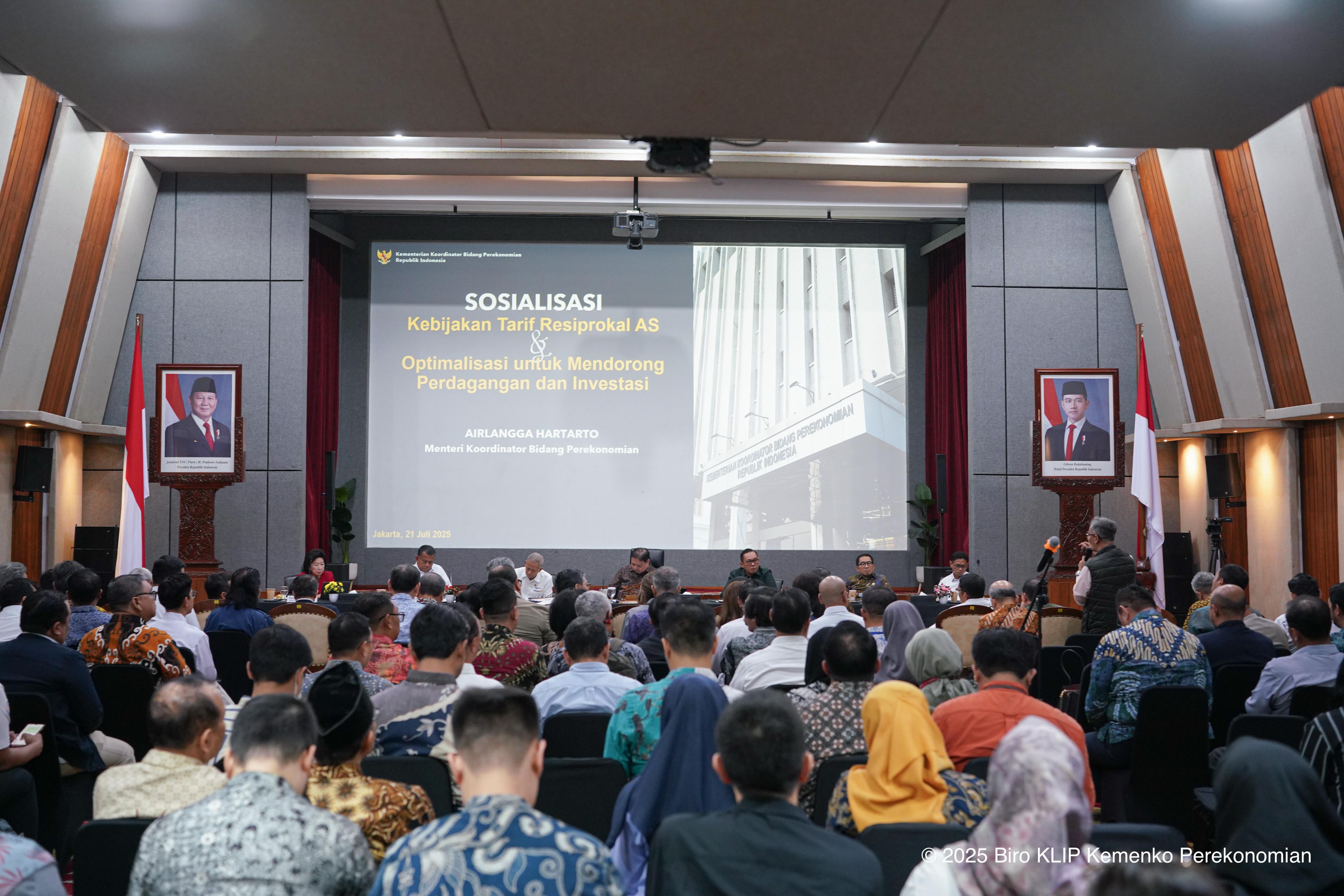Sebagai tindak lanjut dari kesepakatan kebijakan tarif tersebut, Pemerintah secara aktif berupaya meningkatkan pemahaman stakeholders terkait dengan menggelar agenda sosialisasi kepada pelaku usaha dan asosiasi mengenai kebijakan tarif resiprokal AS dalam mendorong investasi dan perdagangan ke depan, di Kantor Kemenko Perekonomian, Senin (21/7/2025).