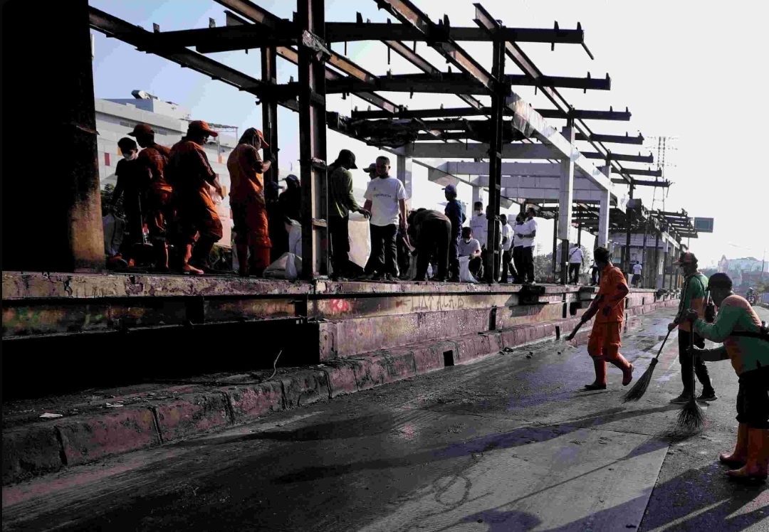 Mereka bergotong royong melakukan pembersihan dan pemulihan sejumlah fasilitas umum yang terdampak, termasuk Halte Senen Sentral, Halte Toyota Rangga, serta area kaki-kaki Jembatan Penyeberangan Orang (JPO).