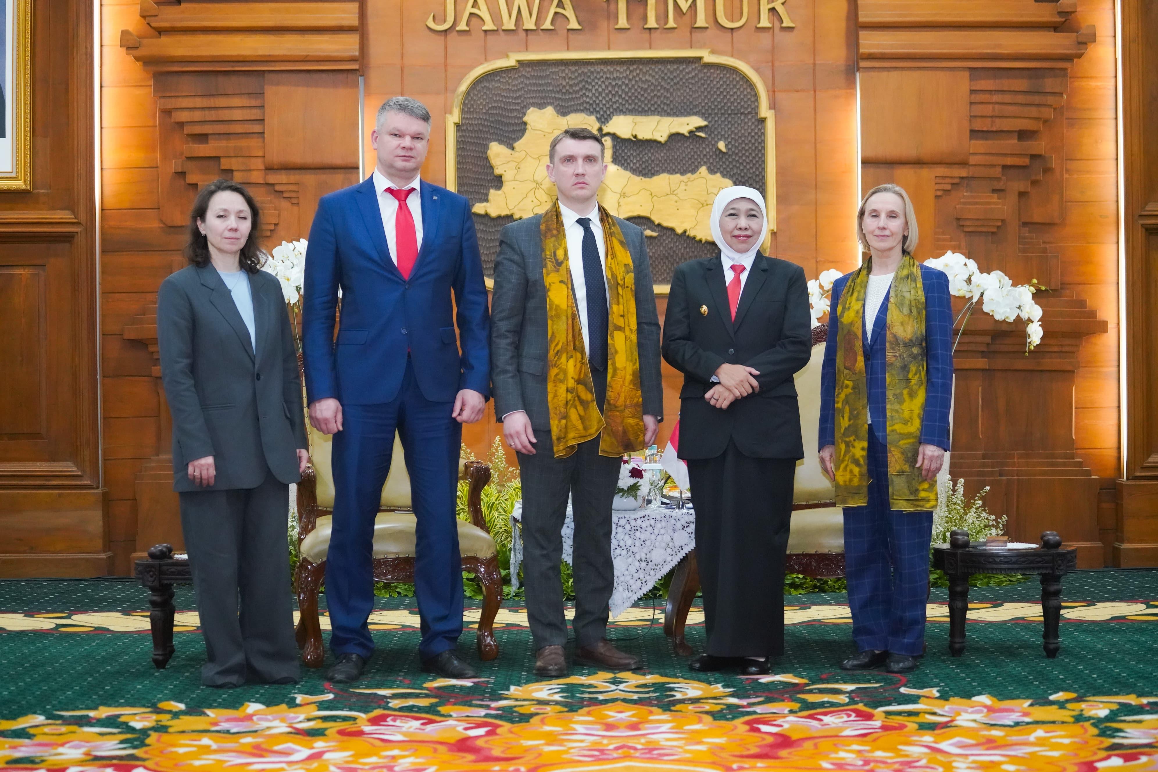 SURABAYA, 17 APRIL 2025 – Gubernur Jawa Timur Khofifah Indar Parawansa menerima kunjungan Delegasi Provinsi Tomsk, Rusia di Gedung Negara Grahadi Surabaya, Rabu (16/4) malam.